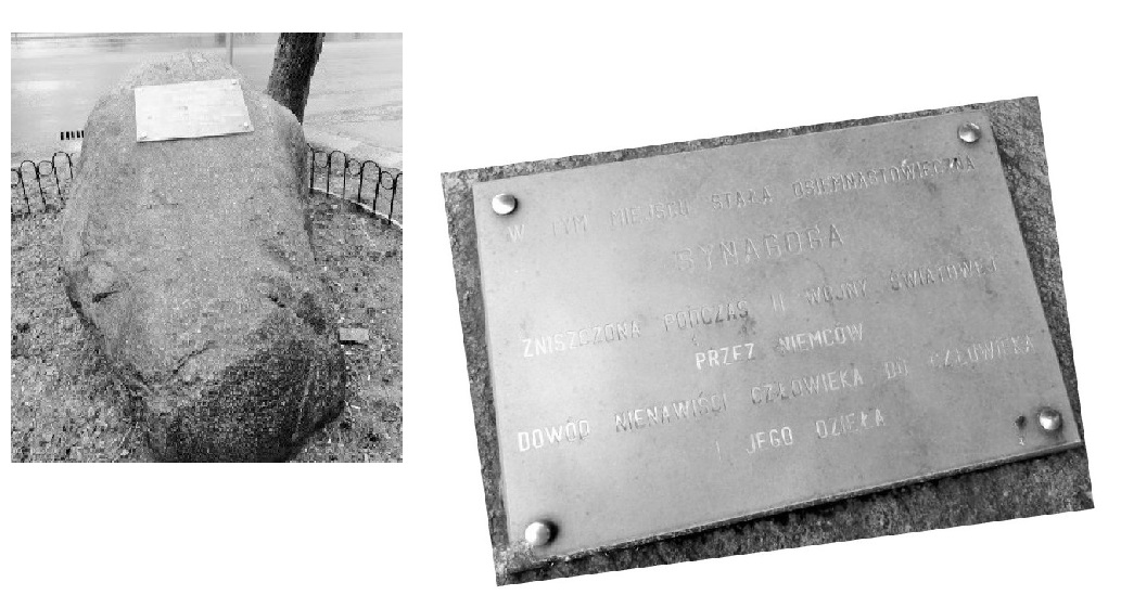 U zbiegu ulic Norberta Barlickiego i Bereka Joselewicza, znajduje się pamiątkowy kamień z inskrypcją: "W tym miejscu stała osiemnastowieczna synagoga, zniszczona podczas II wojny światowej przez Niemców, z nienawiści człowieka do człowieka i jego dzieła".