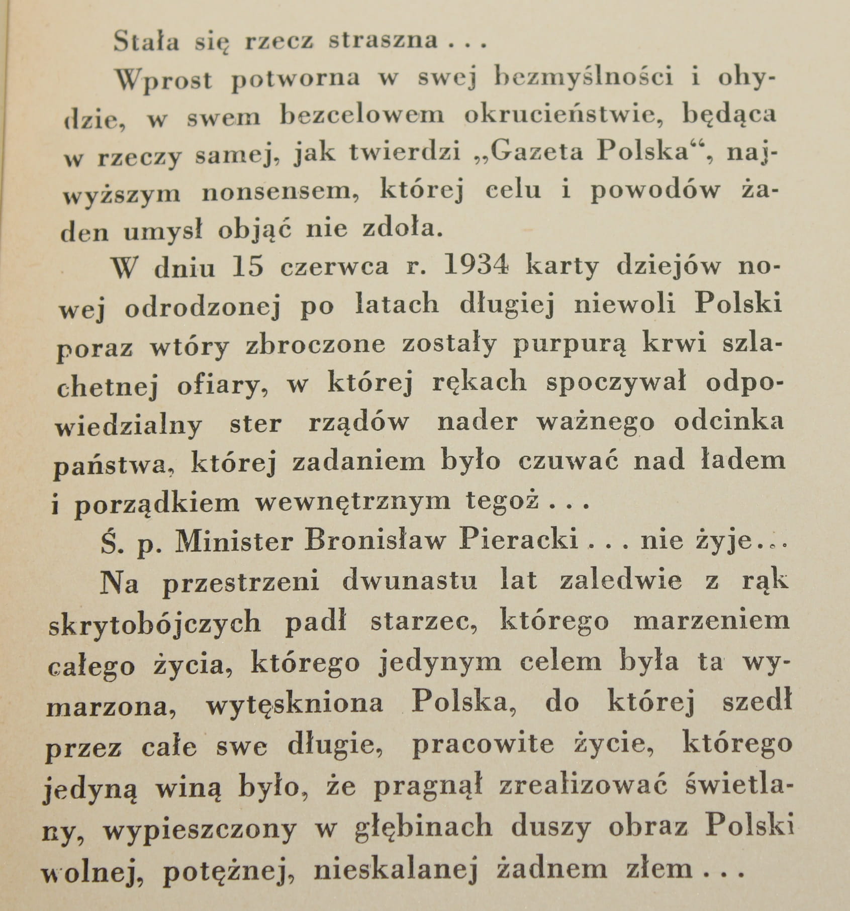 „Ilustrowany Kurjer Codz." pisze.. W chwili, w której piszemy te słowa, zagadka potwornego mordu na osobie śp. Bronisława Pierackiego, ministra spraw wewnętrznych, nie jest jeszcze wyjaśniona. W kaplicy szpitalnej leżą zwłoki człowieka, który dla państwa położył wielkie zasługi i który był jedną z najpoważniejszych rezerw moralnych na przyszłość. Nad katafalkiem zaś unosi się krwawy znak zapytania. Kto i poco? Dlaczego? Miną dni, a może już tylko godziny i śledztwo, które toczy się z całą energją, doprowadzi zapewne do wykrycia sprawców, a przynajmniej do wyszukania właściwego tropu. Wtedy będzie czas i pora, by rozważyć polityczne podłoże dokonanego mordu i wysnuć odpowiednie wnioski. Dziś stwierdzić tylko należy jedno: że nie wolno tolerować zbrodniczych odruchów anarchji. Odpowiedzią społeczeństwa na mord warszawski musi być konsolidacja opinji, przenikniętej świadomością, że naczelnym nakazem polskiej racji stanu jest zapewnienie siły Rzeczypospolitej przez wewnętrzną dyscyplinę, ład i porządek.
