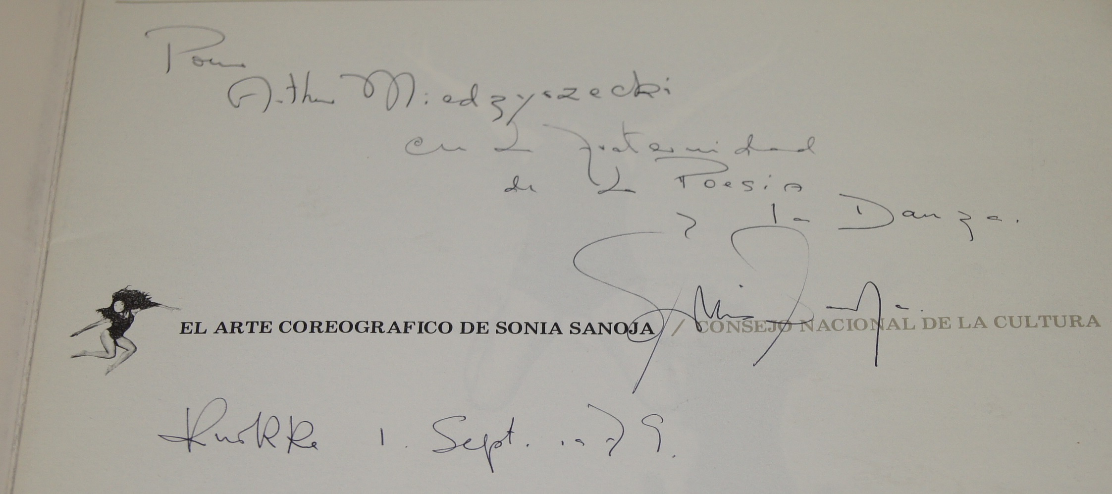 Sonia Sanoja [Caracas , 2.IV.1932- Caracas 26.III.2017] - wenezuelska tancerka, choreografka i poetka. Pionierka tańca współczesnego w Wenezueli. / Egzemplarz z dedykacją Sonii Sanoji dla Artura Międzyrzeckiego.