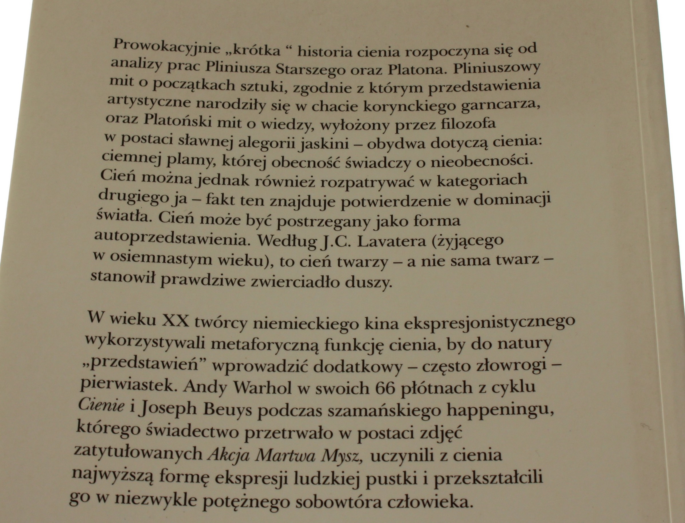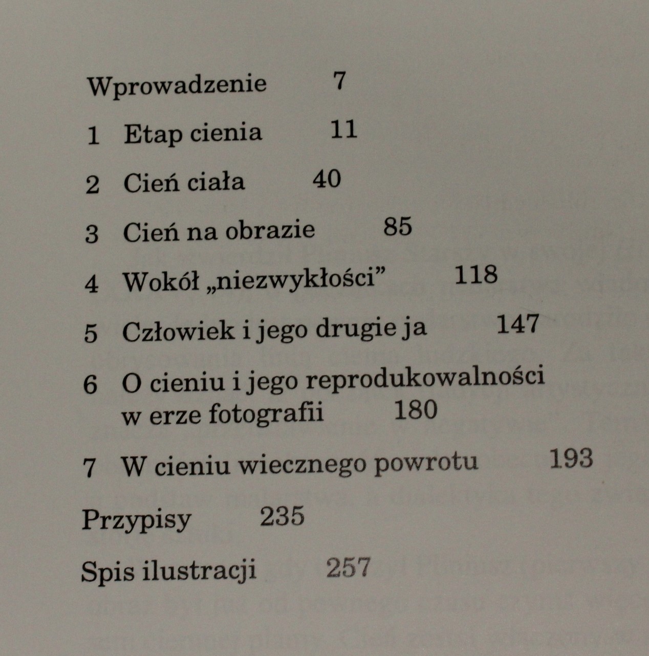 Spis treści: Etap cienia Cień ciała Cień na obrazie Wokół niezwykłości Człowiek i jego drugie ja O cieniu i jego reproduktywności w erze fotografii W cieniu wiecznego powrotu Przypisy / Spis il.