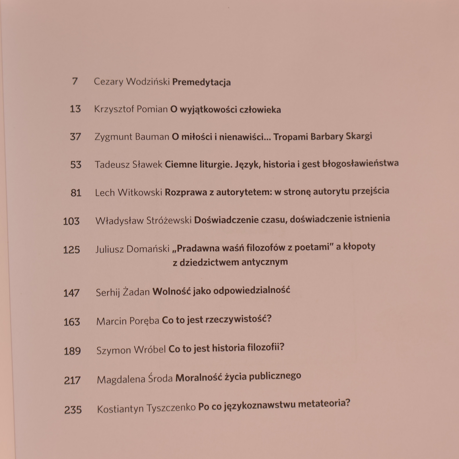 TREŚĆ: Cezary Wodziński, Premedytacja / Krzysztof Pomian, O wyjątkowości człowieka / Zygmunt Bauman, O miłości i nienawiści… Tropami Barbary Skargi / Tadeusz Sławek, Ciemne liturgie. Język, historia i gest błogosławieństwa / Lech Witkowski, Rozprawa z autorytetem: w stronę autorytu przejścia / Władysław Stróżewski, Doświadczenie czasu, doświadczenie istnienia / Juliusz Domański, „Pradawna waśń filozofów z poetami” a kłopoty z dziedzictwem antycznym / Serhij Żadan, Wolność jako odpowiedzialność / Marcin Poręba, Co to jest rzeczywistość? / Szymon Wróbel, Co to jest historia filozofii? / Magdalena Środa, Moralność życia publicznego / Kostiantyn Tyszczenko, Po co językoznawstwu metateoria?
