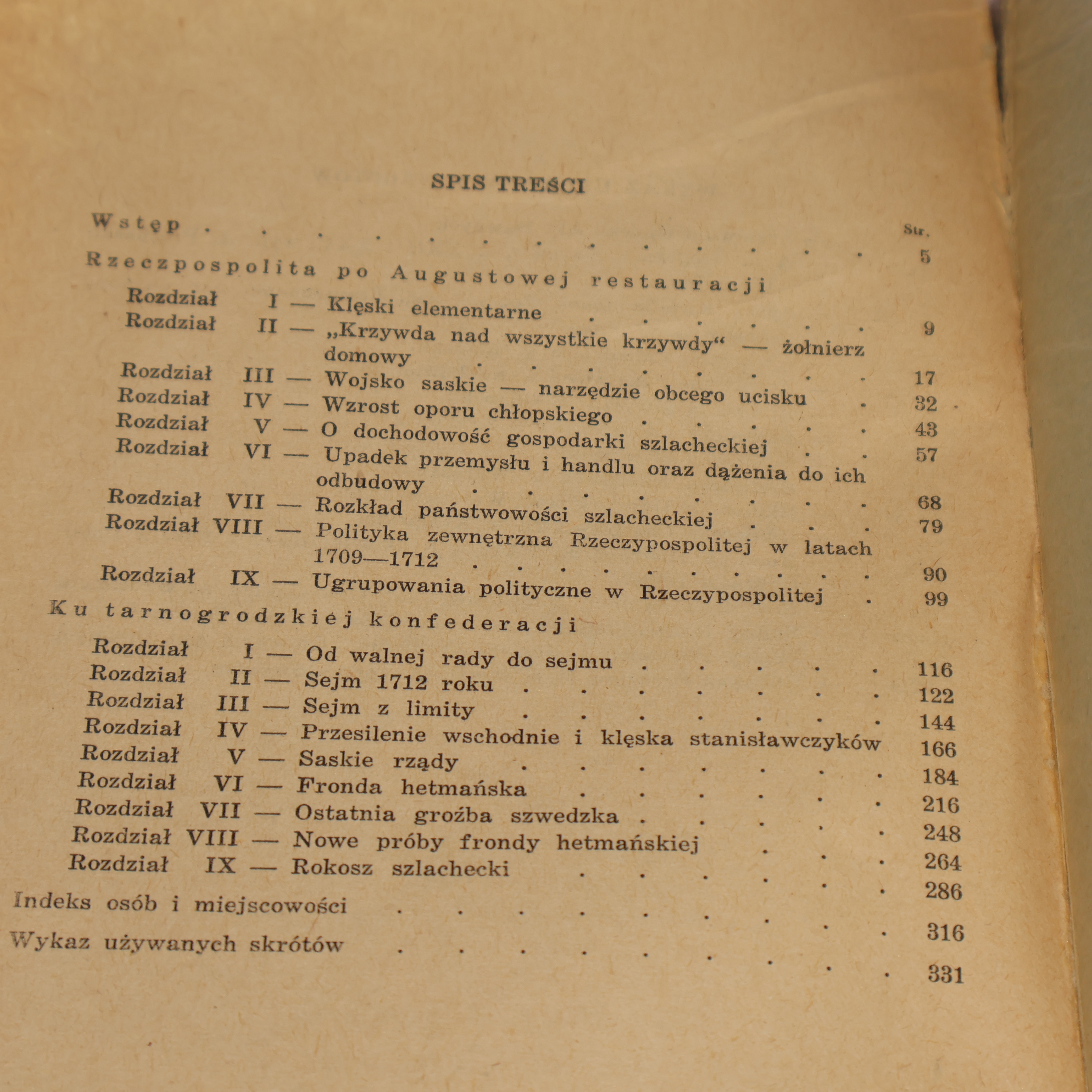 Z TREŚCI: Klęski elementarne / "Krzywda nad wszystkie krzywdy" - żołnierz domowy / Wojsko saskie - narzędzie obcego ucisku / Wzrost oporu chłopskiego / O dochodowość gospodarki szlacheckiej / Upadek przemysłu i handlu oraz dążenie do ich odbudowy / Rozkład państwowości szlacheckiej / Polityka zawnętrzna Rzeczypospolitej w latach 1709-1712 / Ugrupowania polityczne w Rzeczypospolitej...