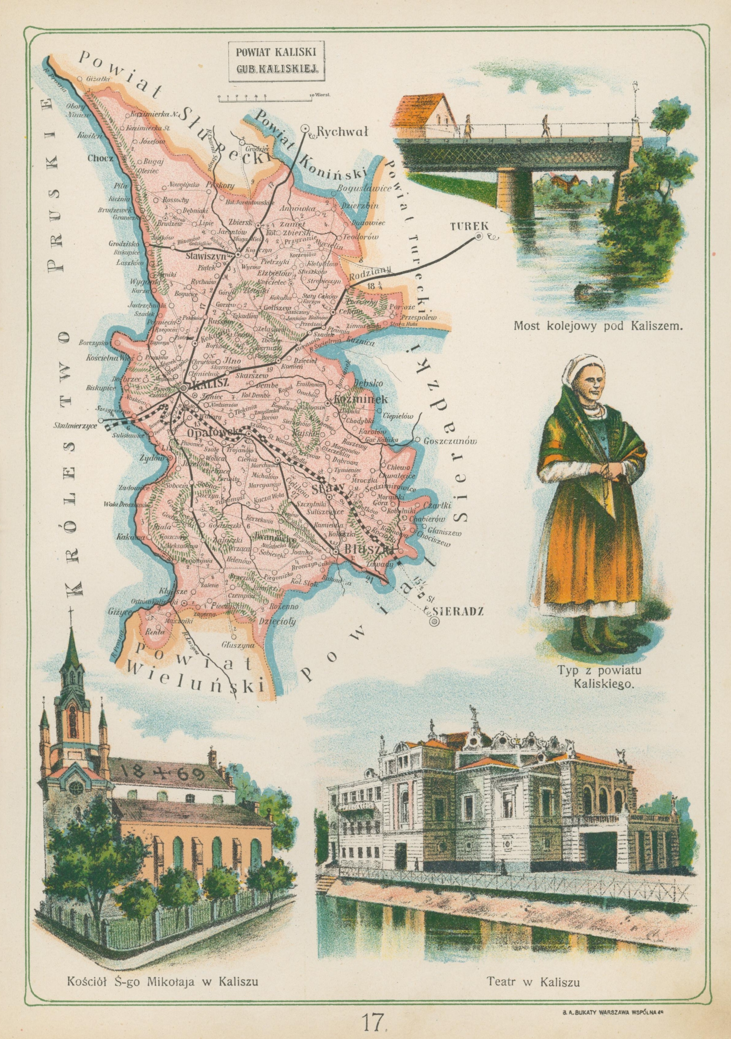 dodatkowe informacje Litografia z Atlasu geograficznego ilustrowanego Królestwa Polskiego. Przedstawia mapę Królestwa Polskiego z podziałem na gubernie i powiaty. Wydanie: Warszawa 1907, wyd. J. M. Bazewicz [lit. B. A. Bukaty].