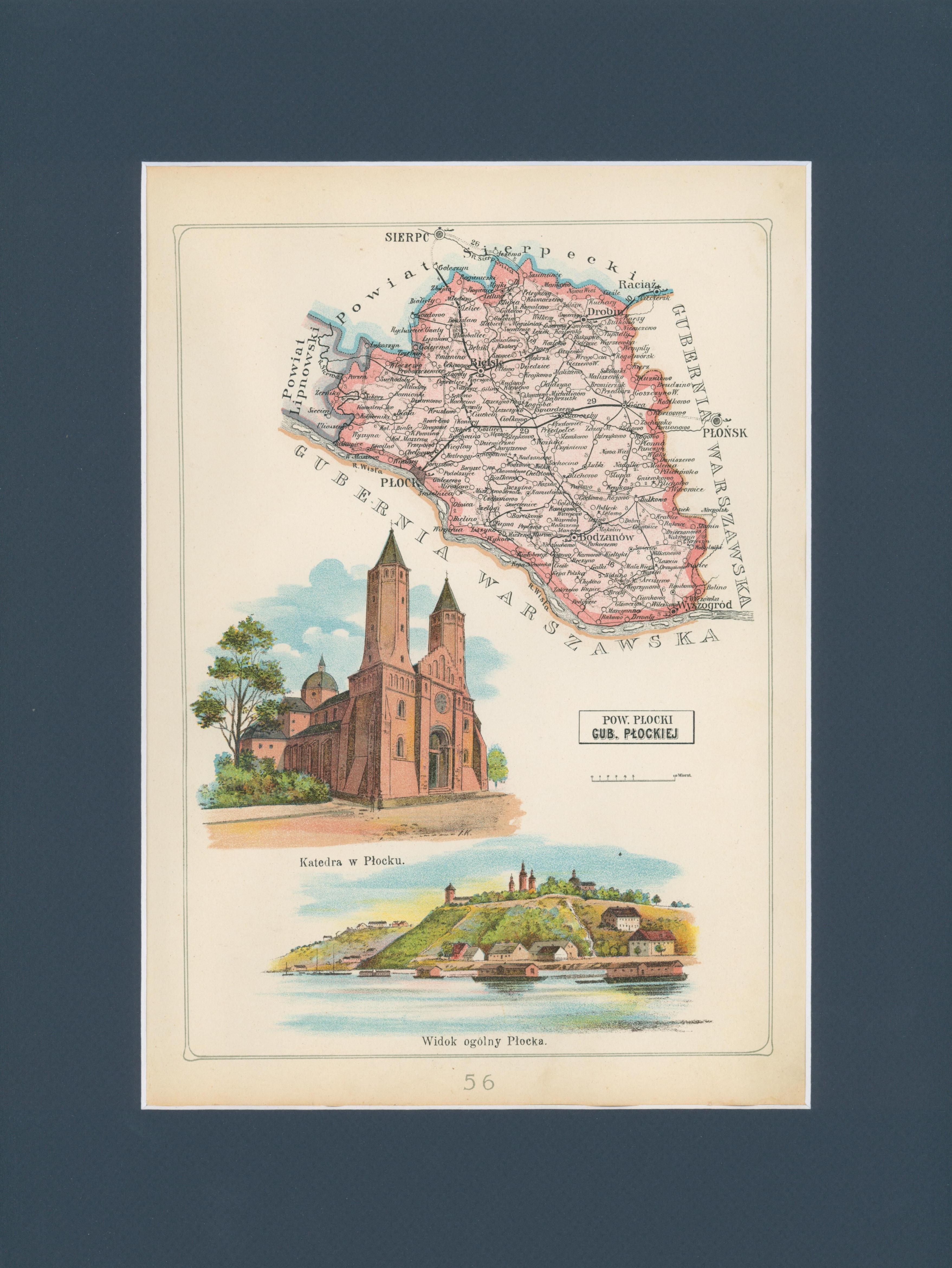 dodatkowe informacje Litografia z Atlasu geograficznego ilustrowanego Królestwa Polskiego. Przedstawia mapę Królestwa Polskiego z podziałem na gubernie i powiaty. Wydanie: Warszawa 1907, wyd. J. M. Bazewicz [lit. B. A. Bukaty].
