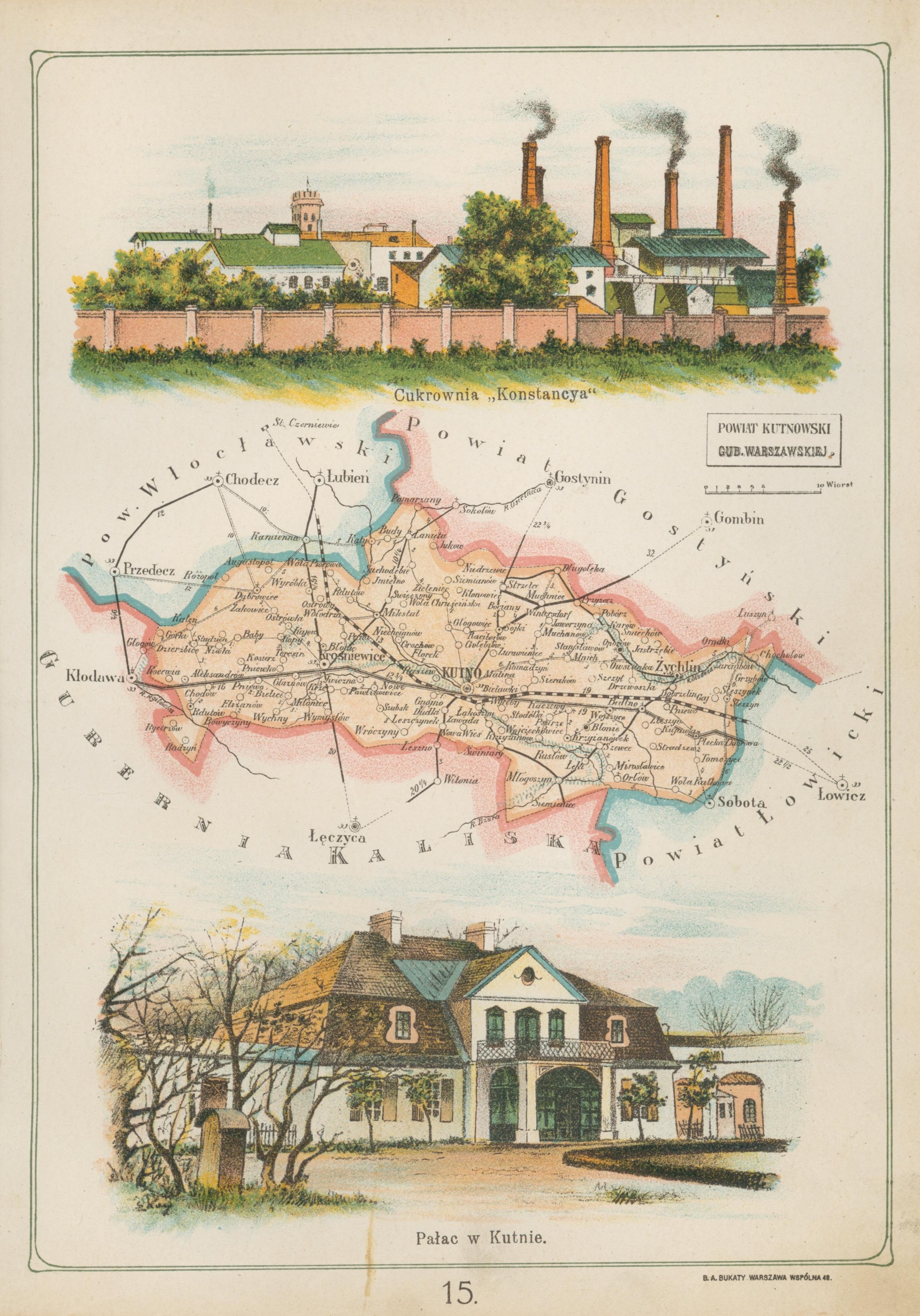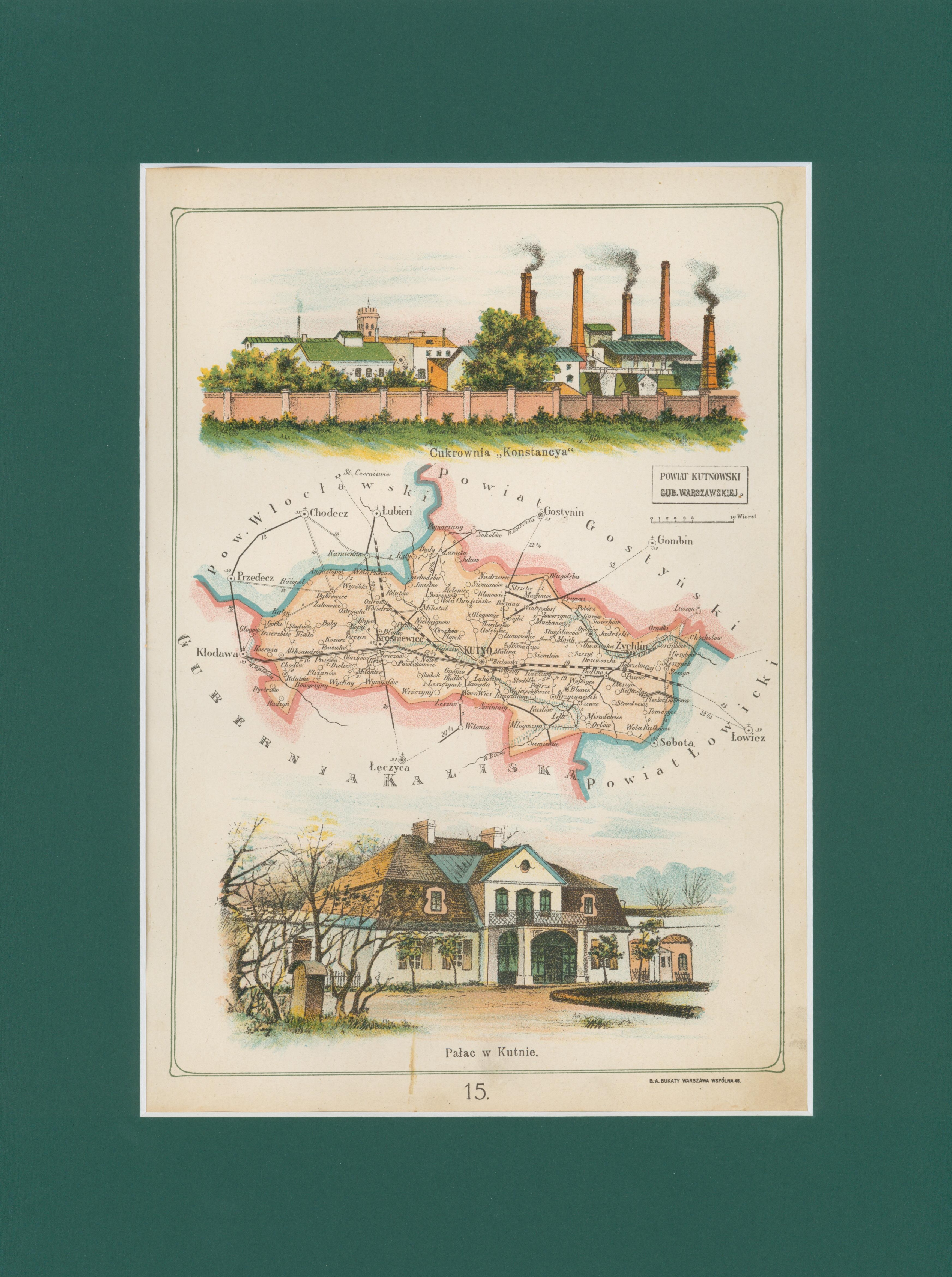 dodatkowe informacje Litografia z Atlasu geograficznego ilustrowanego Królestwa Polskiego. Przedstawia mapę Królestwa Polskiego z podziałem na gubernie i powiaty. Wydanie: Warszawa 1907, wyd. J. M. Bazewicz [lit. B. A. Bukaty].