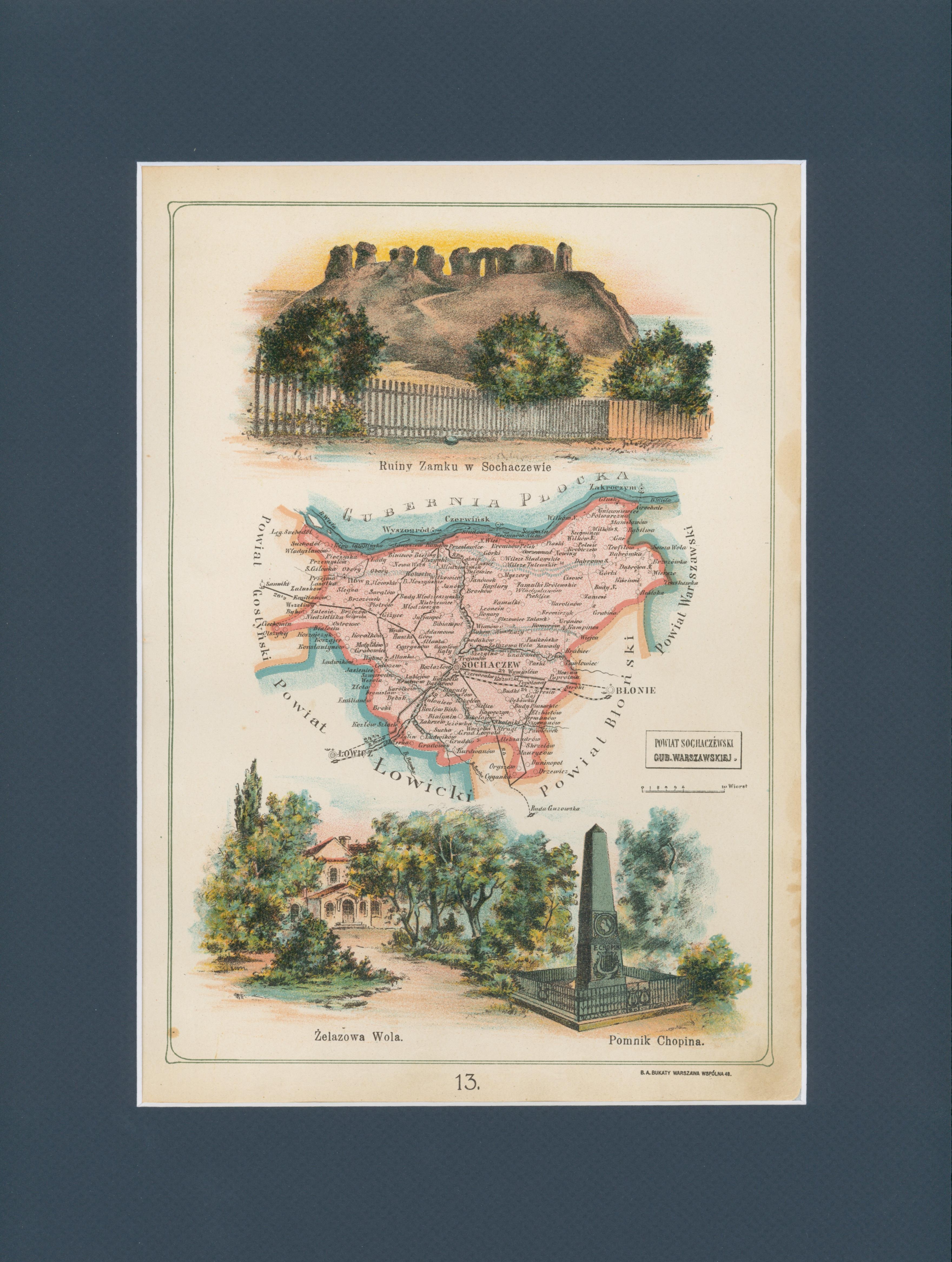dodatkowe informacje Litografia z Atlasu geograficznego ilustrowanego Królestwa Polskiego. Przedstawia mapę Królestwa Polskiego z podziałem na gubernie i powiaty. Wydanie: Warszawa 1907, wyd. J. M. Bazewicz [lit. B. A. Bukaty].