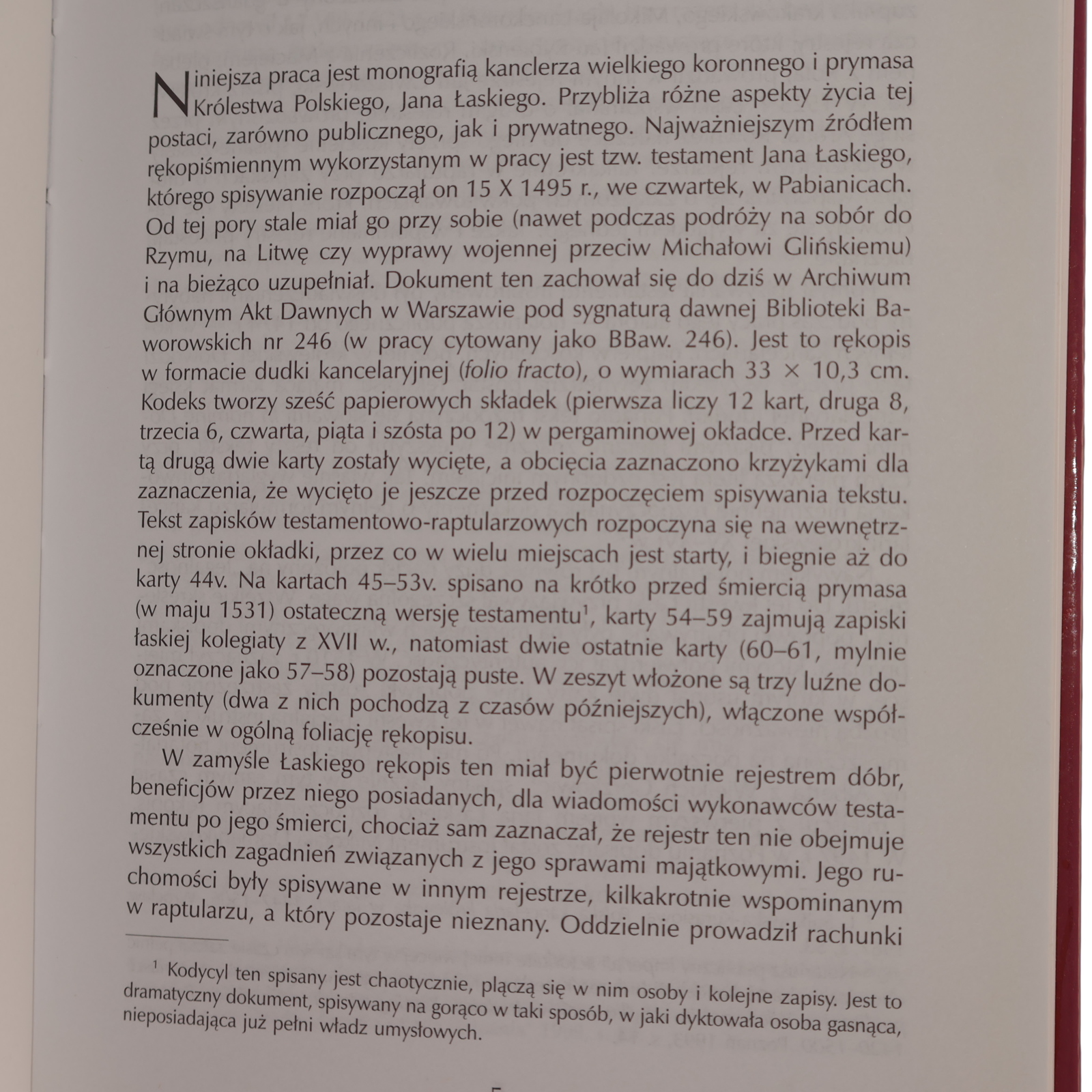 Niniejsza praca jest monografią kanclerza wielkiego koronnego i prymasa NKrólestwa Polskiego, Jana Laskiego. Przybliża różne aspekty życia tej postaci, zarówno publicznego, jak i prywatnego. Najważniejszym źródłem rękopiśmiennym wykorzystanym w pracy jest tzw. testament Jana Laskiego, którego spisywanie rozpoczął on 15 X 1495 r., we czwartek, w Pabianicach. Od tej pory stale miał go przy sobie (nawet podczas podróży na sobór do Rzymu, na Litwę czy wyprawy wojennej przeciw Michałowi Glińskiemu) i na bieżąco uzupełniał. Dokument ten zachował się do dziś w Archiwum Głównym Akt Dawnych w Warszawie pod sygnaturą dawnej Biblioteki Baworowskich nr 246 (w pracy cytowany jako BBaw. 246). Jest to rękopis w formacie dudki kancelaryjnej (folio fracto), o wymiarach 33 x 10,3 cm. Kodeks tworzy sześć papierowych składek (pierwsza liczy 12 kart, druga 8, trzecia 6, czwarta, piąta i szósta po 12) w pergaminowej okładce. Przed kartą drugą dwie karty zostały wycięte, a obcięcia zaznaczono krzyżykami dla zaznaczenia, że wycięto je jeszcze przed rozpoczęciem spisywania tekstu. Tekst zapisków testamentowo-raptularzowych rozpoczyna się na wewnętrznej stronie okładki, przez co w wielu miejscach jest starty, i biegnie aż do karty 44v. Na kartach 45-53v. spisano na krótko przed śmiercią prymasa (w maju 1531) ostateczną wersję testamentu', karty 54-59 zajmują zapiski laskiej kolegiaty z XVII w., natomiast dwie ostatnie karty (60-61, mylnie oznaczone jako 57-58) pozostają puste. W zeszyt włożone są trzy luźne dokumenty (dwa z nich pochodzą z czasów późniejszych), włączone współcześnie w ogólną foliację rękopisu. W zamyśle Laskiego rękopis ten miał być pierwotnie rejestrem dóbr, beneficjów przez niego posiadanych, dla wiadomości wykonawców testamentu po jego śmierci, chociaż sam zaznaczał, że rejestr ten nie obejmuje wszystkich zagadnień związanych z jego sprawami majątkowymi. Jego ruchomości były spisywane w innym rejestrze, kilkakrotnie wspominanym w raptularzu, a który pozostaje nieznany. Oddzielnie prowadził rachunki ' Kodycyl ten spisany jest chaotycznie, plączą się w nim osoby i kolejne zapisy. Jest to dramatyczny dokument, spisywany na gorąco w taki sposób, w jaki dyktowała osoba gasnąca, nieposiadająca już pełni władz umysłowych. [...]