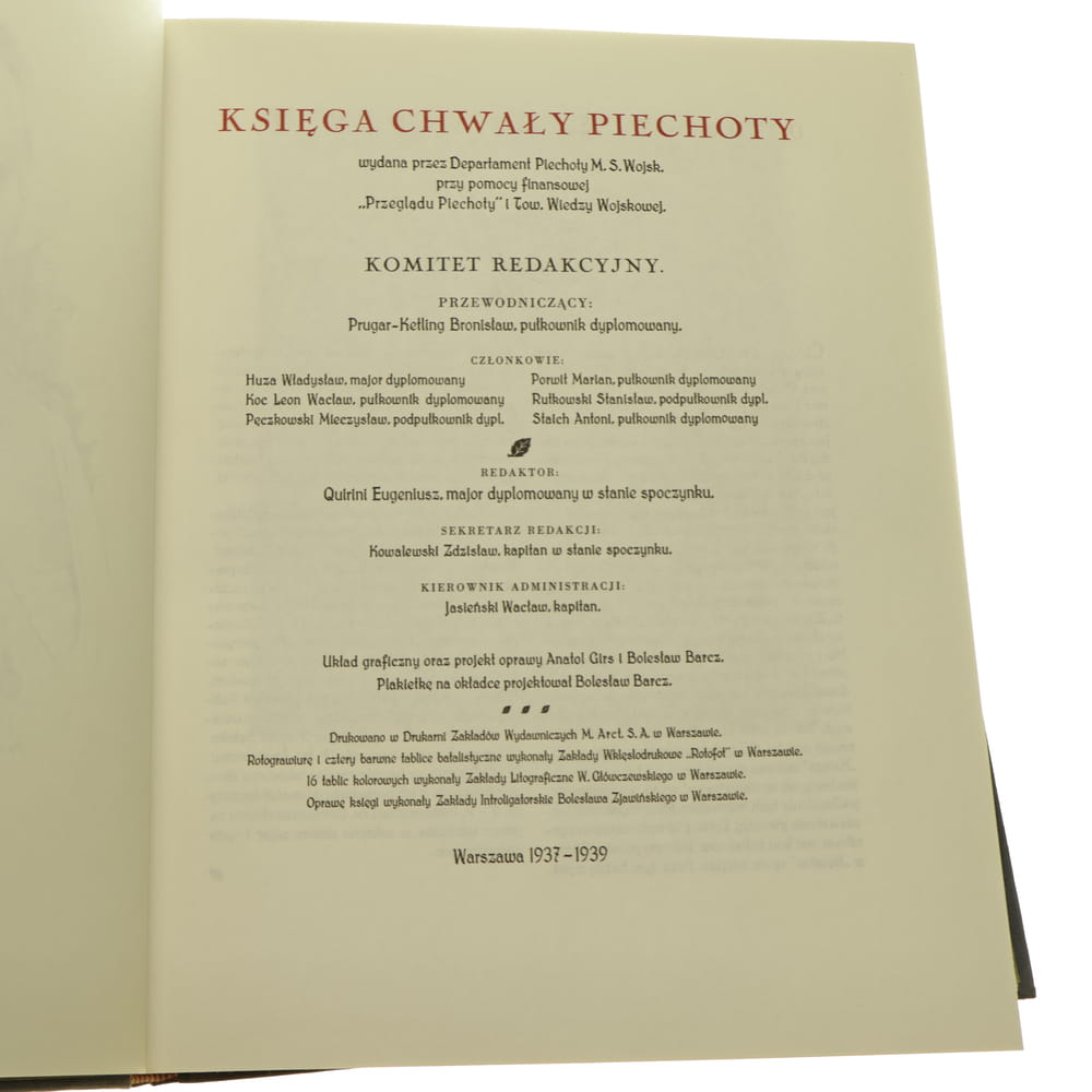 »Księga chwały piechoty [...] Komitet redakcyjny, Przewodniczący Prugar-Ketling Bronisław Układ graf. oraz proj. opr. Anatol Girs i Bolesław Barcz [1937-39-reprint-1993]