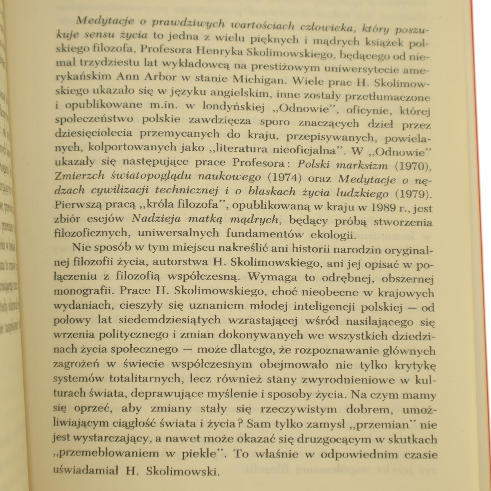 Medytacje o prawdziwych wartościach człowieka, który poszukuje sensu życia Henryk Skolimowski [1991]