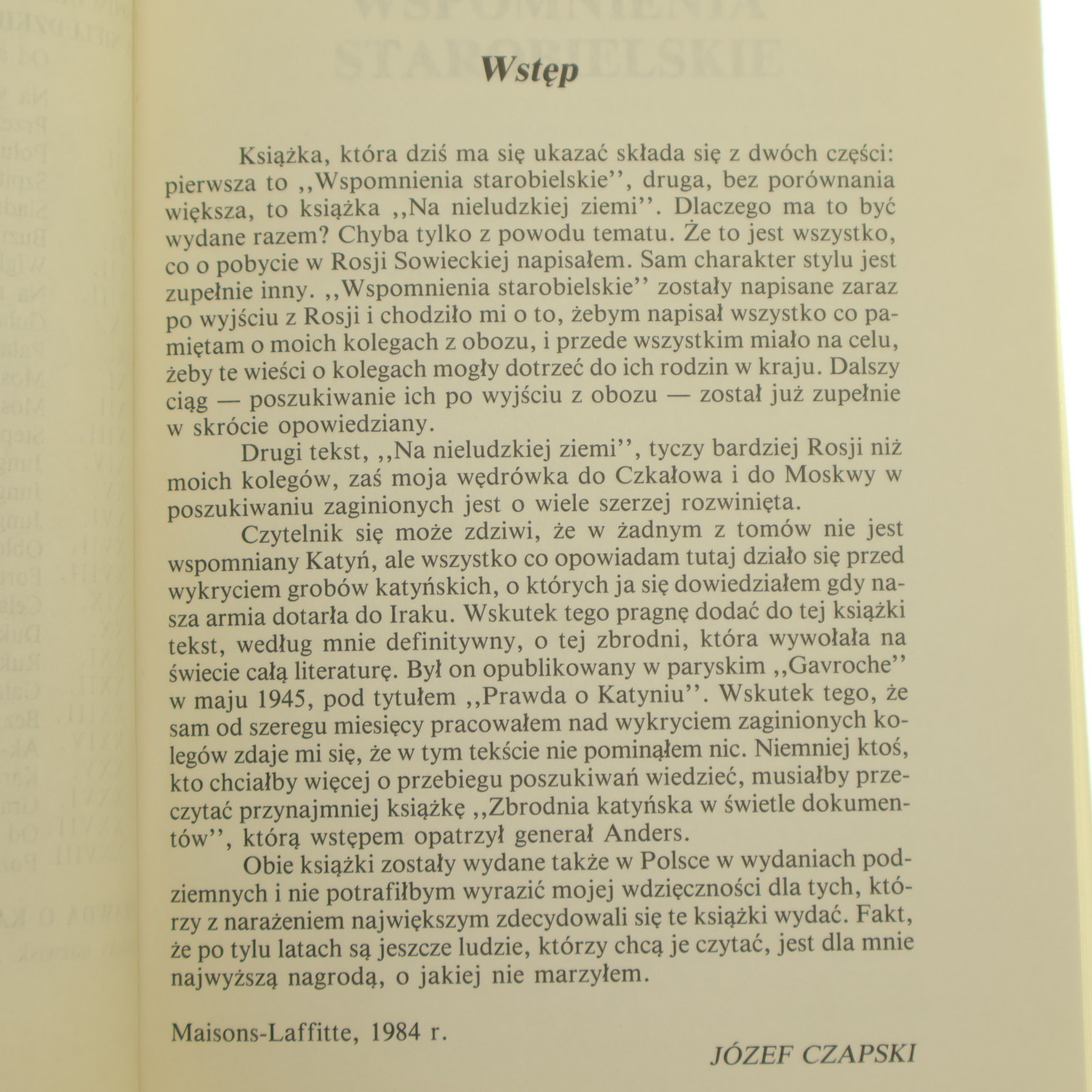 Książka, która dziś ma się ukazać składa się z dwóch części: pierwsza to „Wspomnienia starobielskie”, druga, bez porównania większa, to książka „Na nieludzkiej ziemi”. Dlaczego ma to być wydane razem? Chyba tylko z powodu tematu. Że to jest wszystko, co o pobycie w Rosji Sowieckiej napisałem. Sam charakter stylu jest zupełnie inny. „Wspomnienia starobielskie” zostały napisane zaraz po wyjściu z Rosji i chodziło mi o to, żebym napisał wszystko co pamiętam o moich kolegach z obozu, i przede wszystkim miało na celu, żeby te wieści o kolegach mogły dotrzeć do ich rodzin w kraju. Dalszy ciąg — poszukiwanie ich po wyjściu z obozu — został już zupełnie w skrócie opowiedziany.