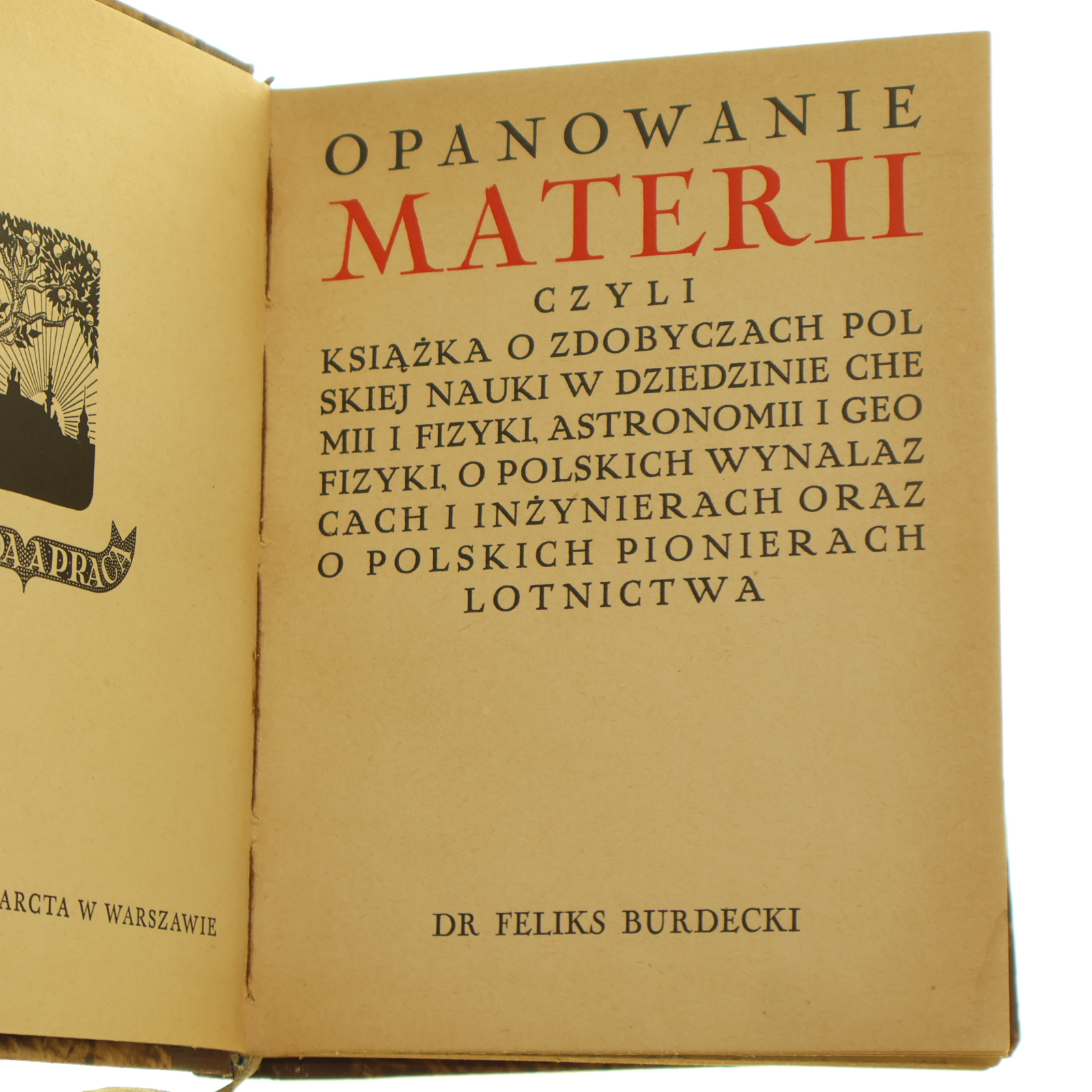Opanowanie materii czyli książka o zdobyczach polskiej nauki w dziedzinie chemii i fizyki, astronomii i geofizyki, o polskich wynalazcach i inżynierach oraz o polskich pionierach lotnictwa Feliks Burdecki [1937]