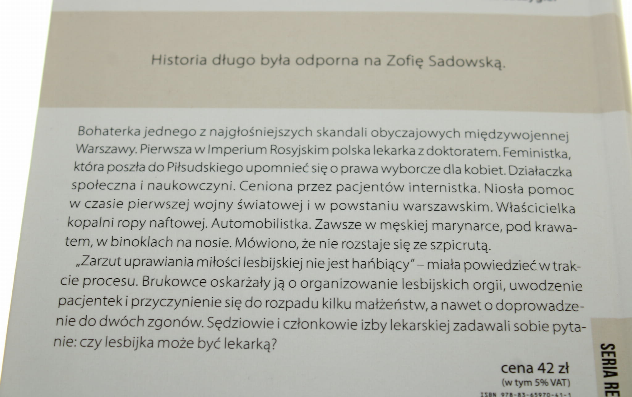 Po sali sądowej musiał rozejść się szum, gdy doktor 'Sadowska oświadczyła: - Zarzut uprawiania miłości lesbijskiej nie jest hańbiący. Jej homoseksualizm potwierdzili rzeczoznawca i sąd powszechny. „Wreszcie ona sama w ostatnim słowie': To, że jest „homoseksualistką czynną", przyznali sędzia referent sądu państwowego i Sąd Naczelnej Izby Lekarskiej, który orzekł, że „jest winną nadużywania stanowiska lekarza celem wciągania kobiet do swych praktyk miłosnych i winną demoralizującego wpływu na otoczenie w związku z jej homo-seksualizmem, niegodnego lekarza". Pierwsza w Imperium Rosyjskim polska lekarka z doktoratem, zaangażowana feministka, działaczka społeczna, zacięta polemistka, jedna z pionierek kobiecego automobilizmu, być może też bezlitosna kamieniczniczka. „Nieposkromione zachcianki zaprowadziły tę kobietę tak daleko, a wiedza jej i fach dały jej tak niebezpieczną broń w rękę, że obowiązkiem było uczynić ją nieszkodliwą". Została oskarżona przez brukowce, występujące „w obronie moralnego zdrowia narodu„ , o to, że "idąc w ślady Safony, hołdowała miłości lesbijskiej”. Prasa chciała chronić naród przed zgnilizną, walczyć z „sza-tanem namiętności". [...]