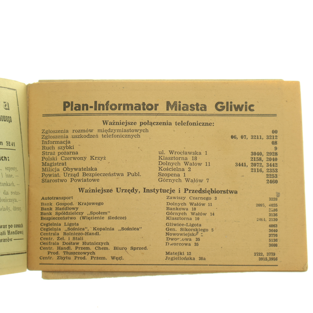 dodatkowe informacje Kolor. plan miasta Gliwice, złoż. Informator zawiera reklamy, spis telefonów do urzędów oraz spis ulic [24 str.]