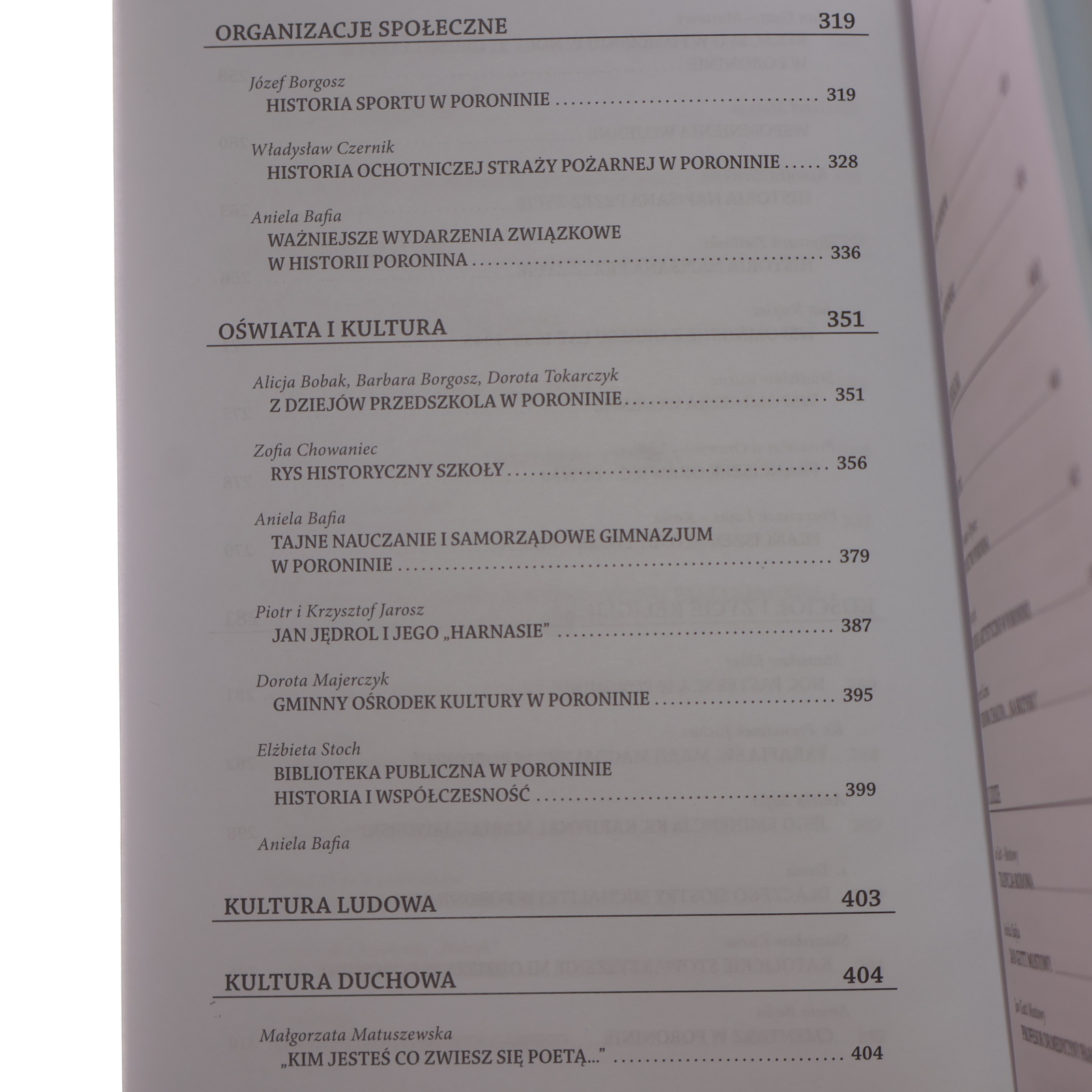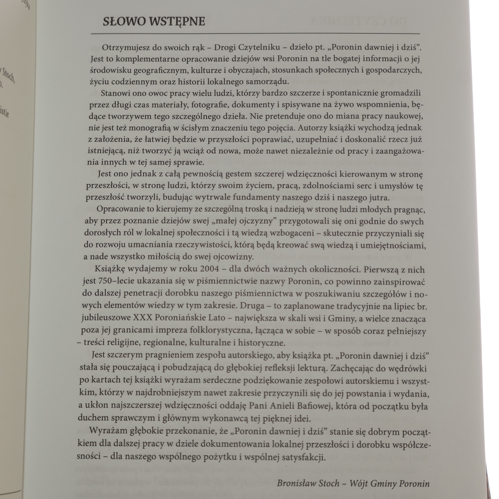 Otrzymujesz do swoich rąk - Drogi Czytelniku - dzieło pt. „Poronin dawniej i dziś". Jest to komplementarne opracowanie dziejów wsi Poronin na tle bogatej informacji o jej środowisku geograficznym, kulturze i obyczajach, stosunkach społecznych i gospodarczych, życiu codziennym oraz historii lokalnego samorządu. Stanowi ono owoc pracy wielu ludzi, którzy bardzo szczerze i spontanicznie gromadzili przez długi czas materiały, fotografie, dokumenty i spisywane na żywo wspomnienia, będące tworzywem tego szczególnego dzieła. Nie pretenduje ono do miana pracy naukowej, nie jest też monografią w ścisłym znaczeniu tego pojęcia. Autorzy książki wychodzą jednak z założenia, że łatwiej będzie w przyszłości poprawiać, uzupełniać i doskonalić rzecz już istniejącą, niż tworzyć ją wciąż od nowa, może nawet niezależnie od pracy i zaangażowania innych w tej samej sprawie. Jest ono jednak z całą pewnością gestem szczerej wdzięczności kierowanym w stronę przeszłości, w stronę ludzi, którzy swoim życiem, pracą, zdolnościami serc i umysłów tę przeszłość tworzyli, budując wytrwale fundamenty naszego dziś i naszego jutra. Opracowanie to kierujemy ze szczególną troską i nadzieją w stronę ludzi młodych pragnąc, aby przez poznanie dziejów swej „małej ojczyzny" przygotowali się oni godnie do swych dorosłych ról w lokalnej społeczności i tą wiedzą wzbogaceni - skutecznie przyczyniali się do rozwoju umacniania rzeczywistości, którą będą kreować swą wiedzą i umiejętnościami, a nade wszystko miłością do swej ojcowizny. Książkę wydajemy w roku 2004 - dla dwóch ważnych okoliczności. Pierwszą z nich jest 750-lecie ukazania się w piśmiennictwie nazwy Poronin, co powinno zainspirować do dalszej penetracji dorobku naszego piśmiennictwa w poszukiwaniu szczegółów i nowych elementów wiedzy w tym zakresie. Druga - to zaplanowane tradycyjnie na lipiec br. jubileuszowe XXX Poroniańskie Lato - największa w skali wsi i Gminy, a wielce znacząca poza jej granicami impreza folklorystyczna, łącząca w sobie - w sposób coraz pełniejszy - treści religijne, regionalne, kulturalne i historyczne. Jest szczerym pragnieniem zespołu autorskiego, aby książka pt. „Poronin dawniej i dziś" stała się pouczającą i pobudzającą do głębokiej refleksji lekturą. Zachęcając do wędrówki po kartach tej książki wyrażam serdeczne podziękowanie zespołowi autorskiemu i wszystkim, którzy w najdrobniejszym nawet zakresie przyczynili się do jej powstania i wydania, a ukłon najszczerszej wdzięczności oddaję Pani Anieli Bafiowej, która od początku była duchem sprawczym i głównym wykonawcą tej pięknej idei. Wyrażam głębokie przekonanie, że „Poronin dawniej i dziś" stanie się dobrym początkiem dla dalszej pracy w dziele dokumentowania lokalnej przeszłości i dorobku współczesności - dla naszego wspólnego pożytku i wspólnej satysfakcji.