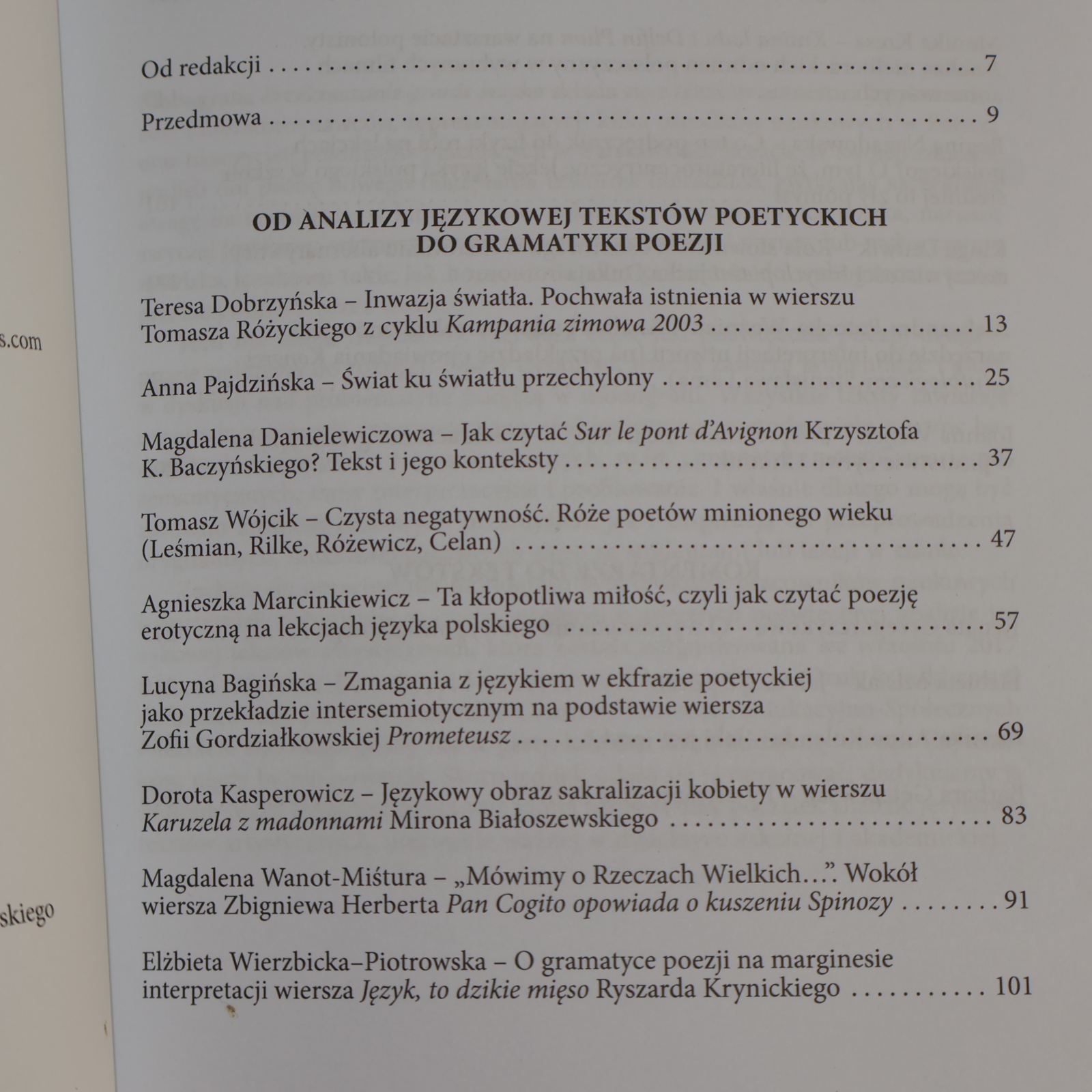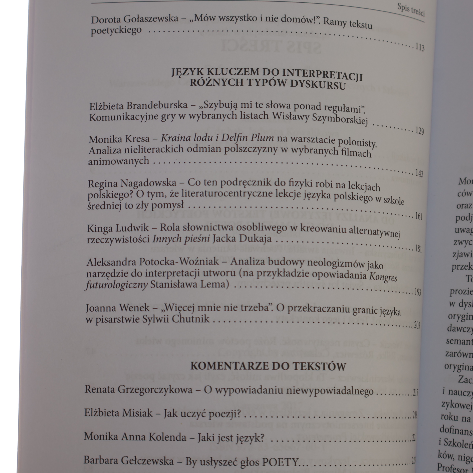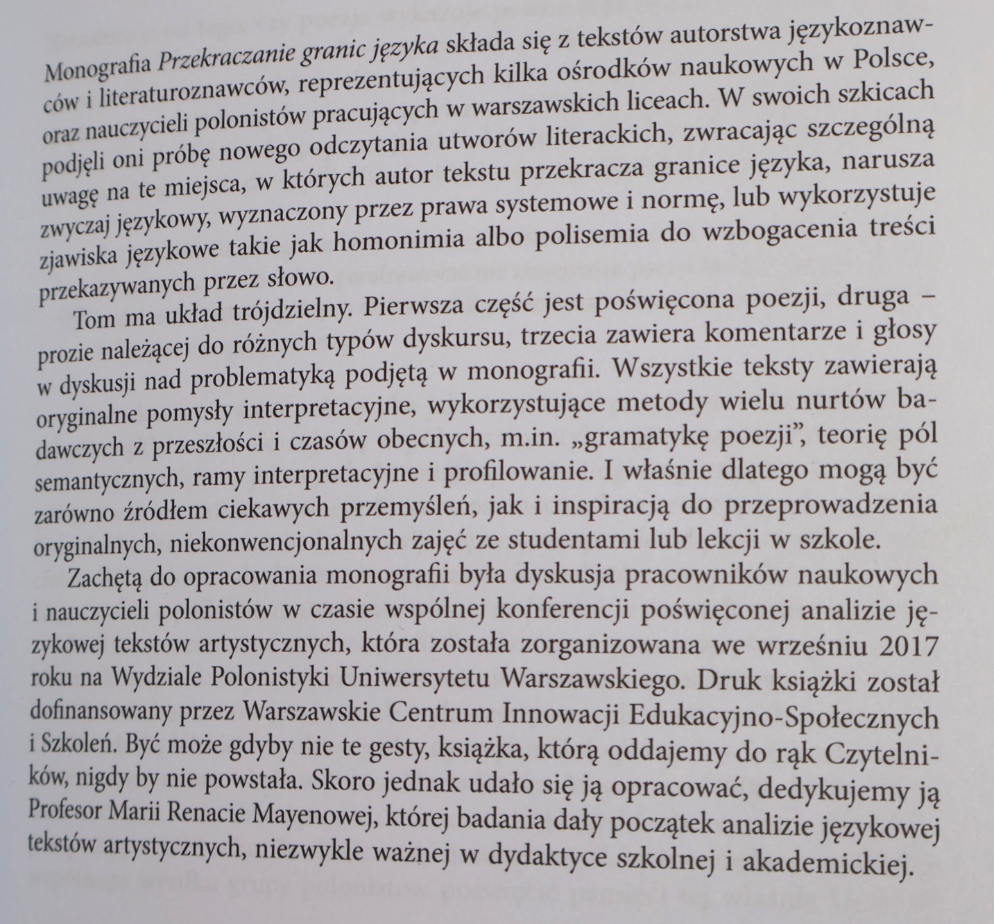 Monografia Przekraczanie granic języka składa się z tekstów autorstwa językoznawców i literaturoznawców, reprezentujących kilka ośrodków naukowych w Polsce, oraz nauczycieli polonistów pracujących w warszawskich liceach. W swoich szkicach podjęli oni próbę nowego odczytania utworów literackich, zwracając szczególną uwagę na te miejsca, w których autor tekstu przekracza granice języka, narusza zwyczaj językowy, wyznaczony przez prawa systemowe i normę, lub wykorzystuje zjawiska językowe takie jak homonimia albo polisemia do wzbogacenia treści przekazywanych przez słowo. Tom ma układ trójdzielny. Pierwsza część jest poświęcona poezji, druga —prozie należącej do różnych typów dyskursu, trzecia zawiera komentarze i głosy w dyskusji nad problematyką podjętą w monografii. Wszystkie teksty zawierają oryginalne pomysły interpretacyjne, wykorzystujące metody wielu nurtów badawczych z przeszłości i czasów obecnych, m.in. „gramatykę poezji", teorię pól semantycznych, ramy interpretacyjne i profilowanie. I właśnie dlatego mogą być zarówno źródłem ciekawych przemyśleń, jak i inspiracją do przeprowadzenia oryginalnych, niekonwencjonalnych zajęć ze studentami lub lekcji w szkole. Zachętą do opracowania monografii była dyskusja pracowników naukowych i nauczycieli polonistów w czasie wspólnej konferencji poświęconej analizie językowej tekstów artystycznych, która została zorganizowana we wrześniu 2017 roku na Wydziale Polonistyki Uniwersytetu Warszawskiego. Druk książki został dofinansowany przez Warszawskie Centrum Innowacji Edukacyjno-Społecznych i Szkoleń. Być może gdyby nie te gesty, książka, którą oddajemy do rąk Czytelników, nigdy by nie powstała. Skoro jednak się ją opracować, dedykujemy ją b Profesor Marii Renacie Mayenowej, której badania dały początek analizie językowej tekstów artystycznych, niezwykle ważnej w dydaktyce szkolnej i akademickiej.