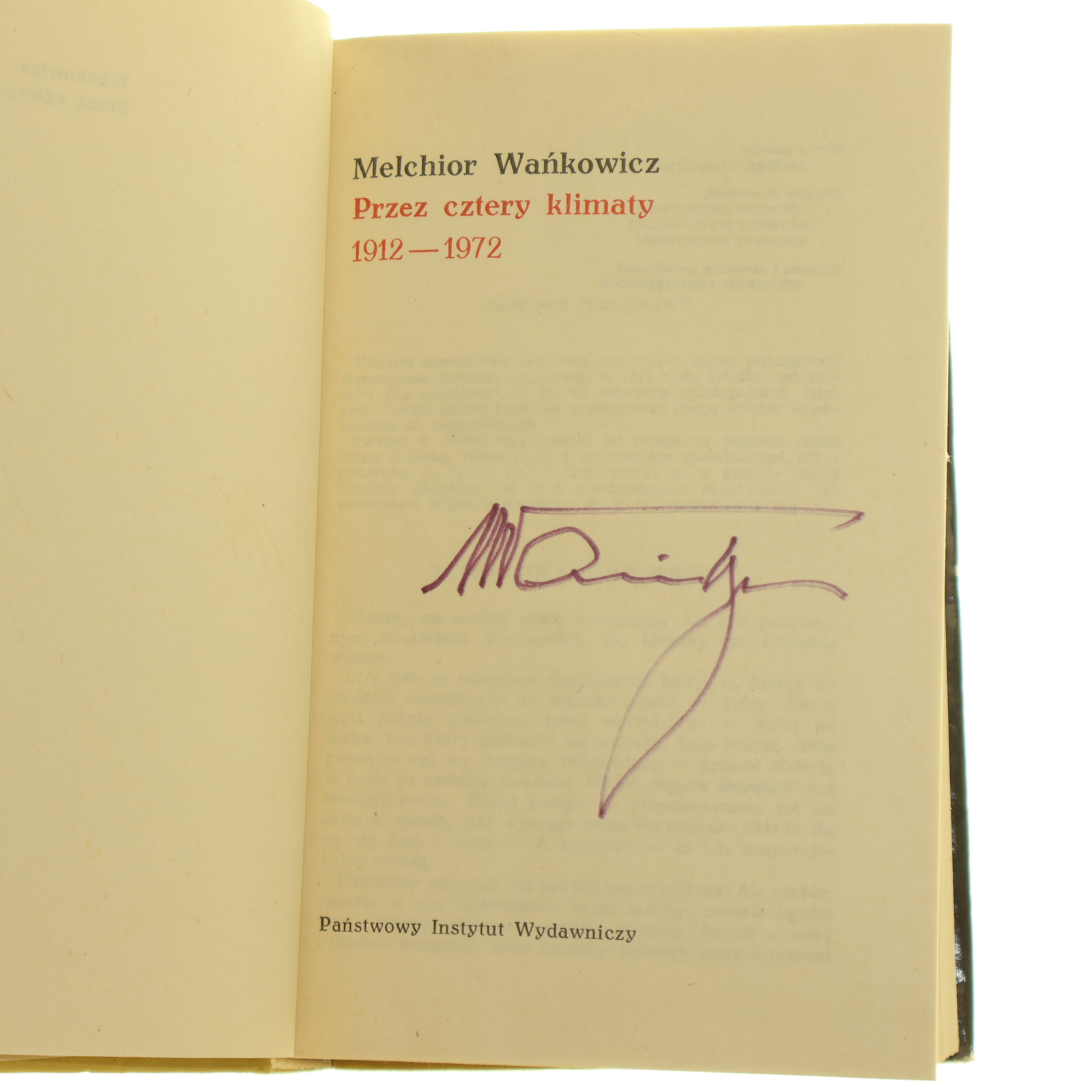 Przez cztery klimaty 1912-1972 Melchior Wańkowicz wybór tekstów Andrzej Garlicki [AUTOGRAF / 1974]