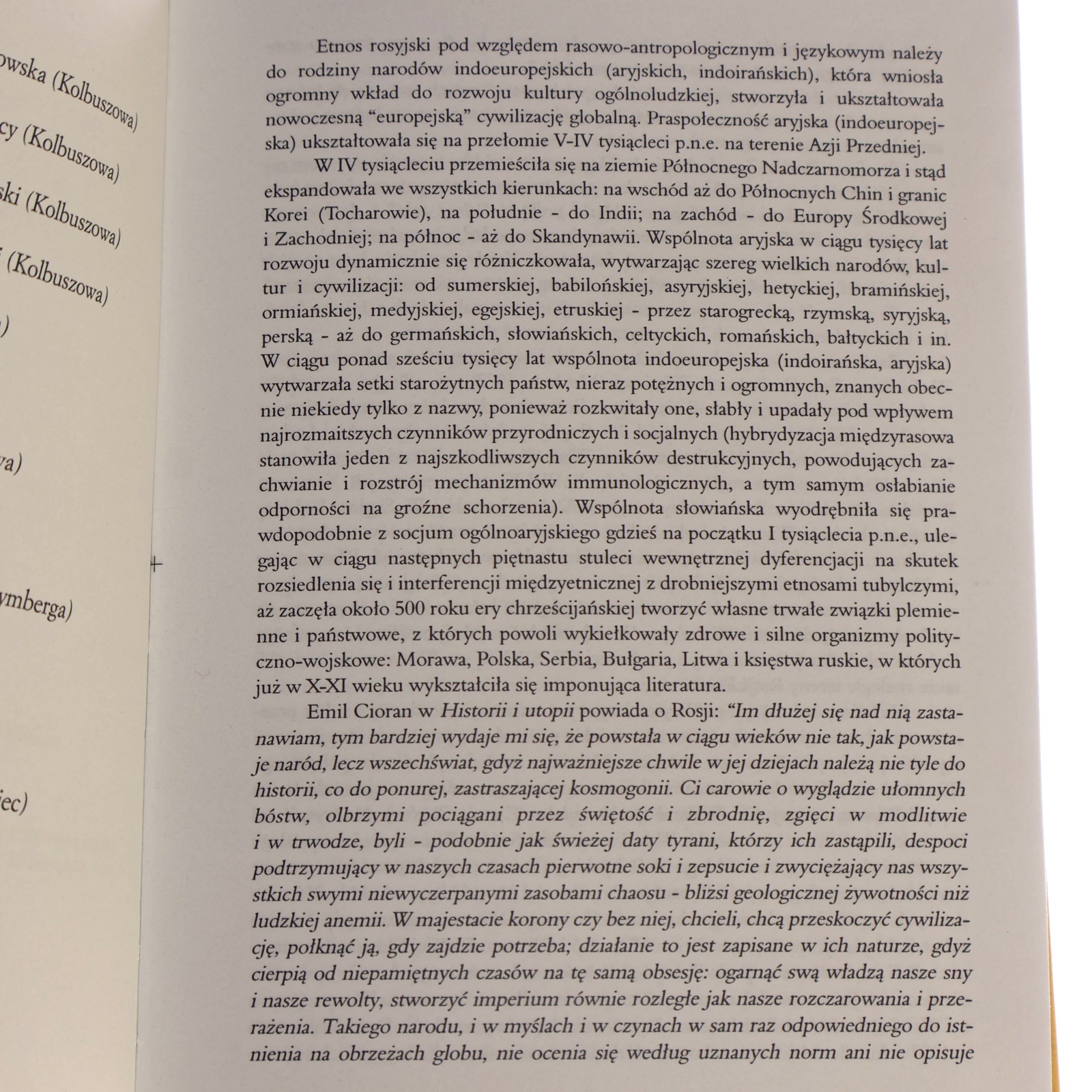 Emil Cioran w Historii i utopii powiada o Rosji: „Im dłużej się nad nią zastanawiam, tym bardziej wydaje mi się, że powstała w ciągu wieków nie tak, jak powstaje naród, lecz wszechświat, gdyż najważniejsze chwile w jej dziejach należą nie tyle do historii, co do ponurej, zastraszającej kosmogonii. Ci carowie o wyglądzie ułomnych bóstw, olbrzymi pociągani przez świętość i zbrodnię, zgięci w modlitwie i w trwodze, byli - podobnie jak świeżej daty tyrani, którzy ich zastąpili, despoci podtrzymujący w naszych czasach pierwotne soki i zepsucie i zwyciężający nas wszystkimi swymi niewyczerpanymi zasobami chaosu - bliżsi geologicznej żywotności niż ludzkiej anemii. W majestacie korony czy bez niej, chcieli, chcą przeskoczyć cywilizację, połknąć ją, gdy zajdzie potrzeba; działanie to jest zapisane w ich naturze, gdyż cierpią od niepamiętnych czasów na tę samą obsesję: ogarnąć swą władzą nasze sny i nasze rewolty, stworzyć imperium równie rozległe jak nasze rozczarowania i przerażenia. Takiego narodu, i w myślach i w czynach w sam raz odpowiedniego do istnienia na obrzeżach globu, nie ocenia się według uznanych norm ani nie opisuje” [...]