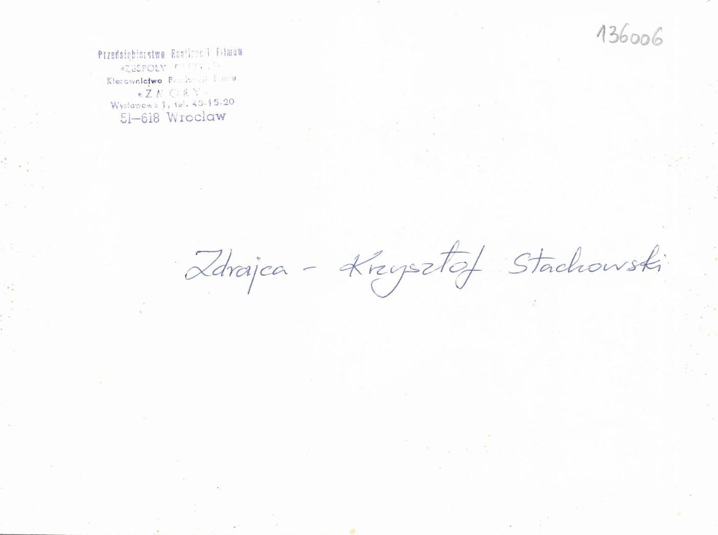 sygnatury / pieczęcie: Pieczęć na rewersie "Zespoły Filmowe". Opis długopisem.