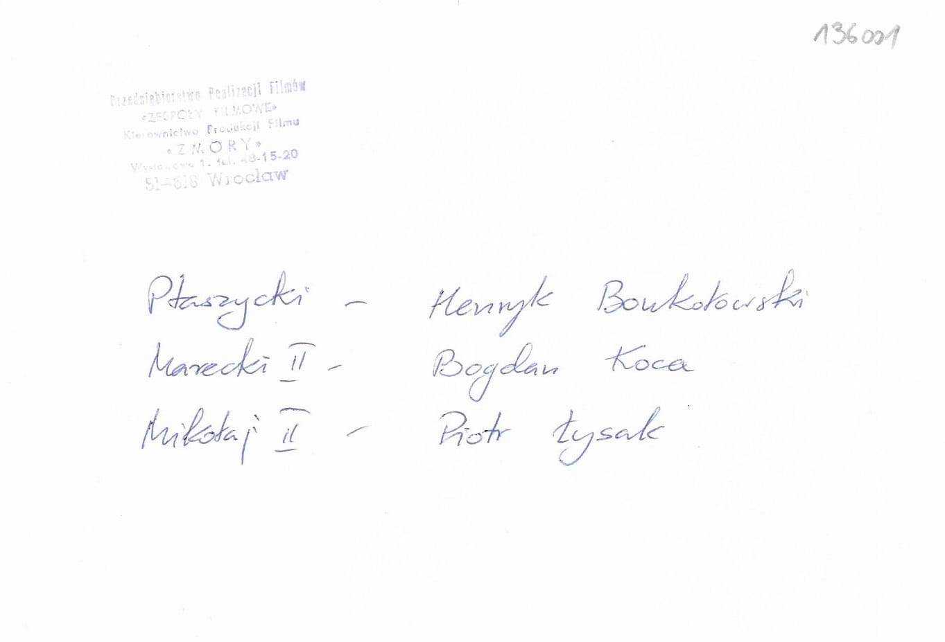 sygnatury / pieczęcie: Pieczęć na rewersie "Zespoły Filmowe". Opis długopisem.