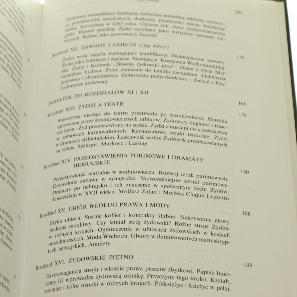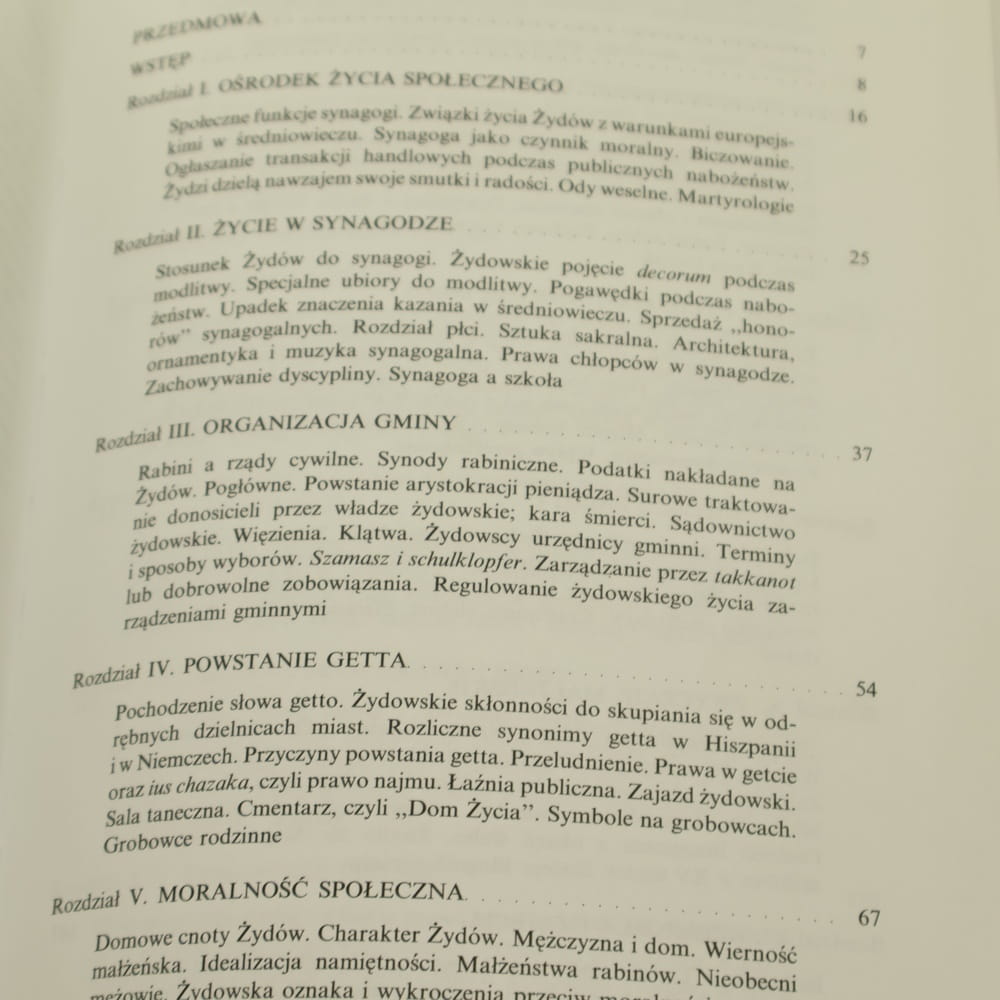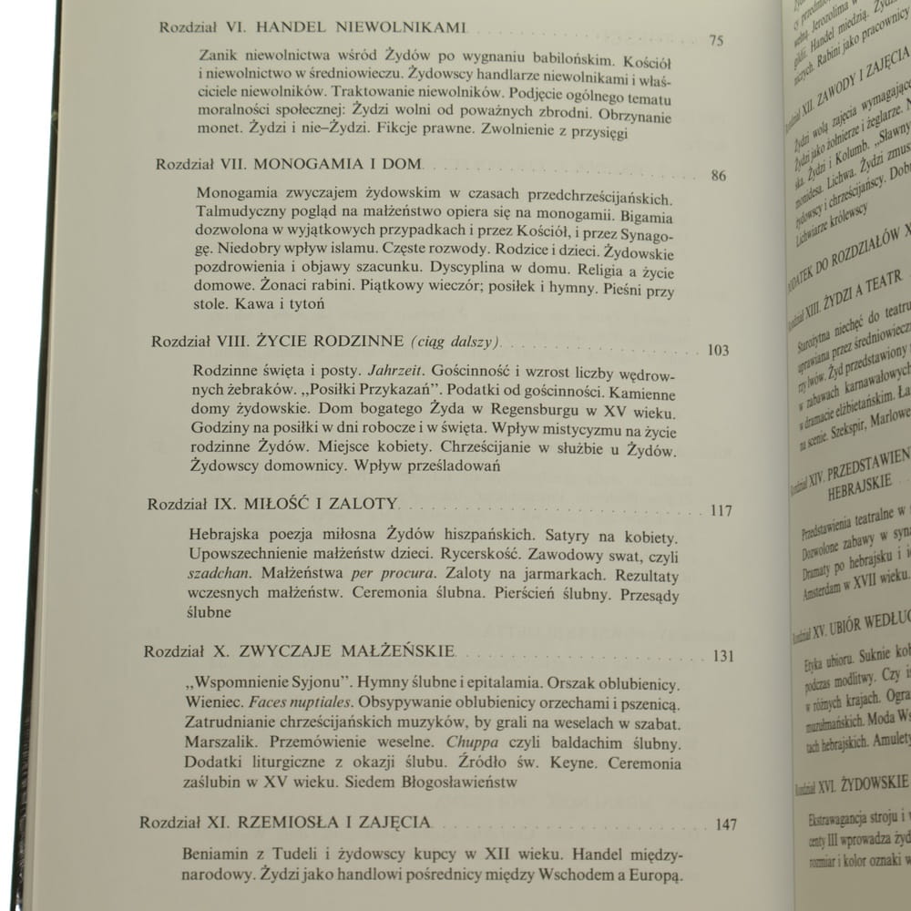 TREŚĆ: Ośrodek życia społ. / Życie w synagodze / Organizacja gminy / Powstanie getta / Moralność społeczna / Handel niewolnikami / Monogamia i dom / Życie rodzinne / Miłość i zaloty / Zwyczaje małżeńskie / Rzemiosła i zajęcia / Zawody i zajęcia / Żydzi a teatr / Przedstawienia purimowe i dramaty hebrajskie / Ubiór wg prawa i mody / Żydowskie piętno / Dobroczynność prywatna i gminna. Pomoc ubogim / Dobroczynność prywatna i gminna. Choroba i niewola / Sredniowieczne szkoły / Zakres wykształcenia / Średniowieczne rozrywki i domowe zabawy / Średniowieczne rozrywki - szachy i karty / Stos. między Żydami a chrześcijanami / Stos. osobiste - przyjaźnie literackie / Wykaz źródeł hebrajskich