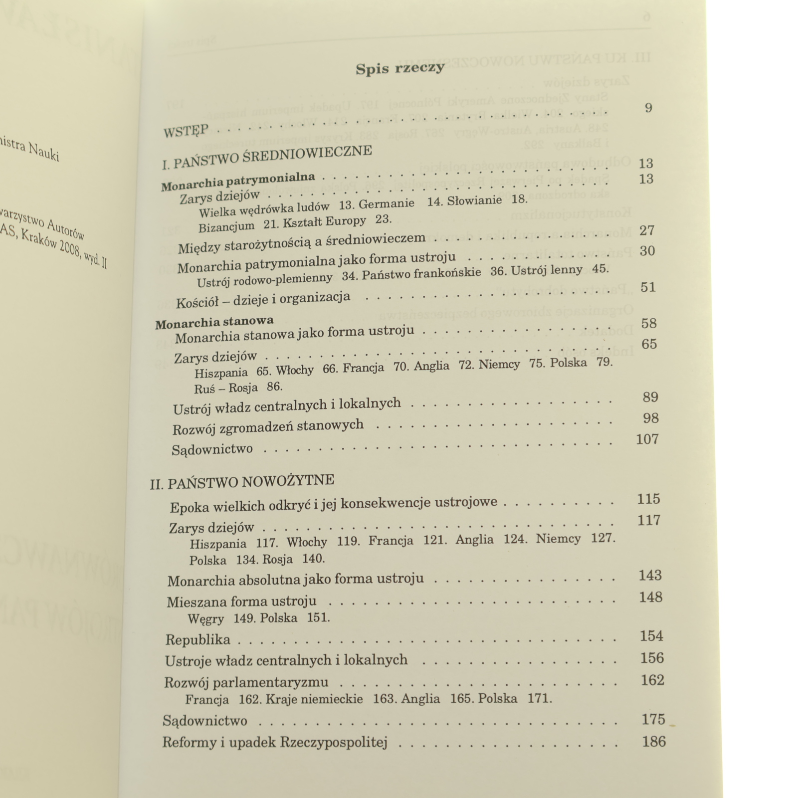 Epoka wielkich odkryć i jej konsekwencje ustrojowe 115 Zarys dziejów 117 Hiszpania 117. Włochy 119. Francja 121. Anglia 124. Niemcy 127. Polska 134. Rosja 140. Monarchia absolutna jako forma ustroju 143 Mieszana forma ustroju 148 Węgry 149. Polska 151. Republika 154 Ustroje władz centralnych i lokalnych 156 Rozwój parlamentaryzmu 162 Francja 162. Kraje niemieckie 163. Anglia 165. Polska 171. Sądownictwo 175 Reformy i upadek Rzeczypospolitej 186