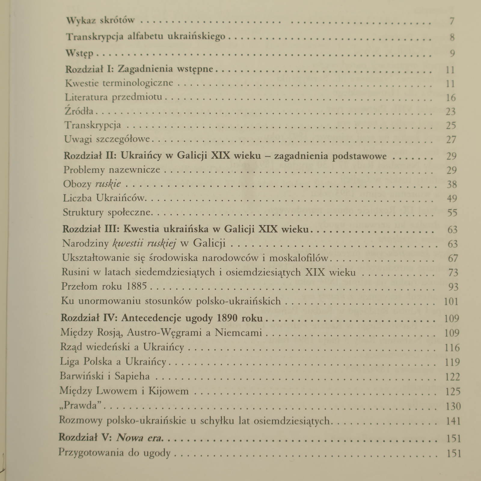 Spis treści (działy): Ukraińcy w Galicji XIX wieku - zagadnienia podstawowe Kwestia ukraińska w Galicji XIX wieku Antecedencje ugody 1890 roku Nowa era Nadzieje Zdobycze. Fonetyka. Rozwój organizacyjny Pierwsze rysy Rozbicie obozu narodowego Zakończenie