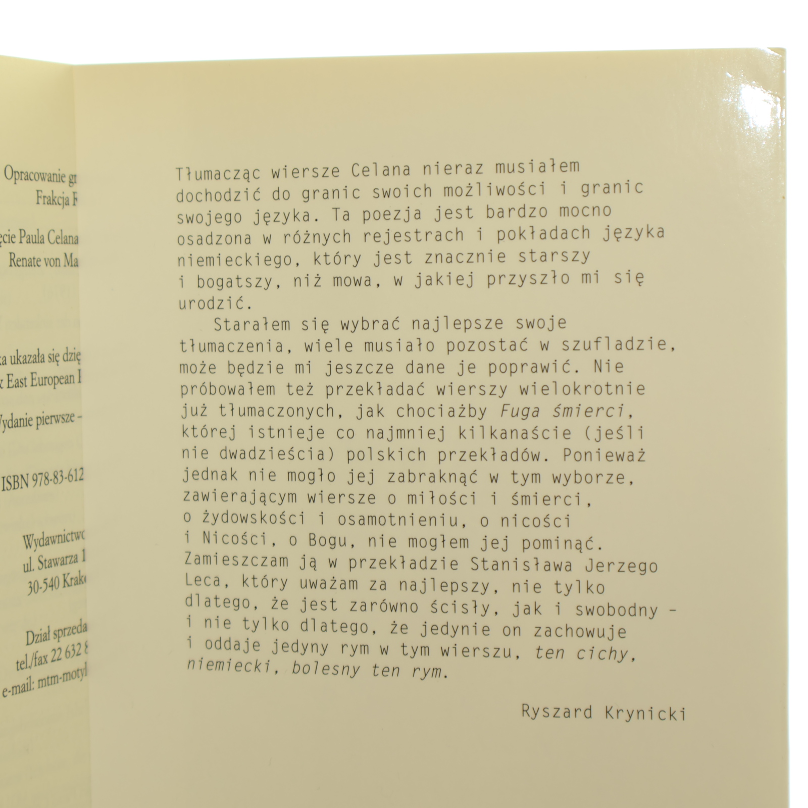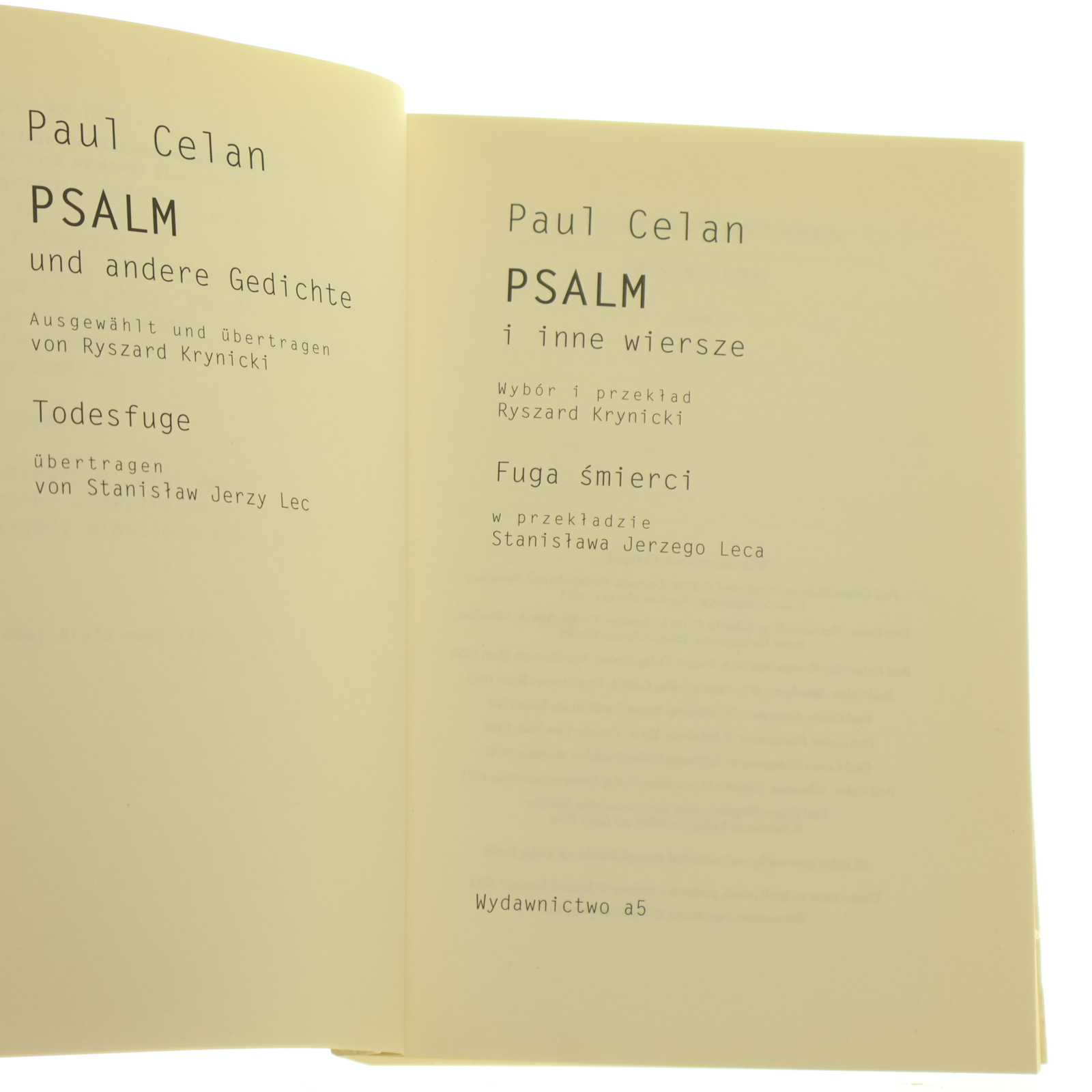 »Psalm i inne wiersze Celan Paul Wybór i przekł. Ryszard Krynicki Fuga śmierci w przekł. Stanisława Jerzego Leca (Biblioteka Poetycka Wydawnictwa a5) (2013)