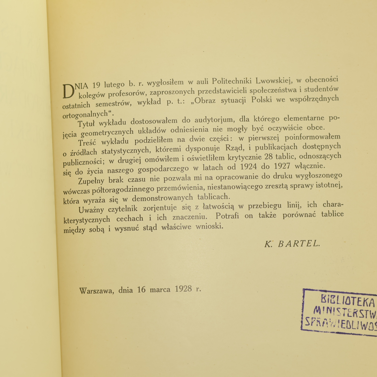 Treść wykładu podzieliłem na dwie części: w pierwszej poinformowałem o źródłach statystycznych, którymi dysponuje Rząd, i publikacjach dostępnych publiczności; w drugiej omówiłem i oświetliłem krytycznie 28 tablic, odnoszących się do życia naszego gospodarczego w latach od 1924 do 1927 włącznie.