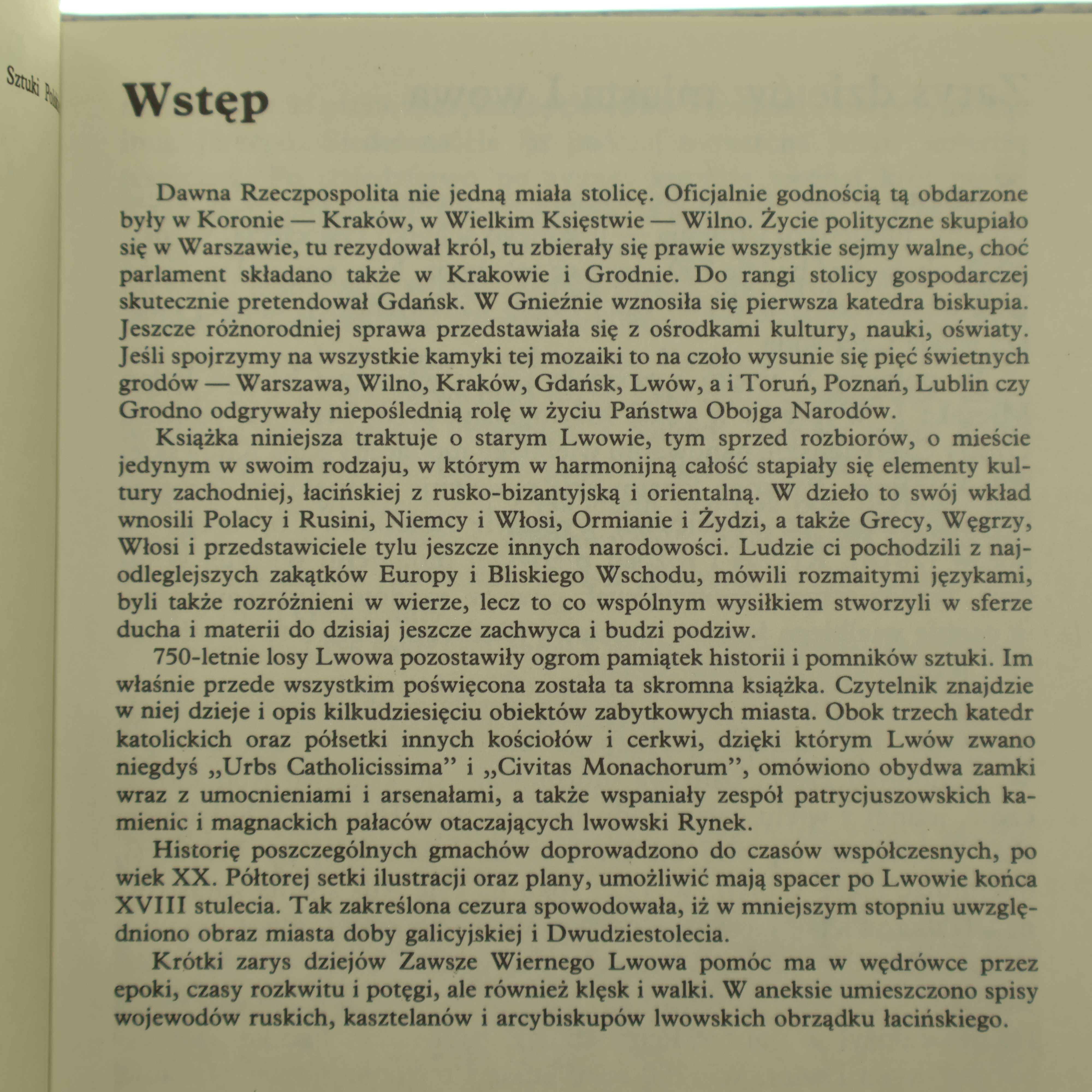 "750-letnie losy Lwowa pozostawiły ogrom pamiątek historii i pomników sztuki. Im właśnie przede wszystkim poświęcona została ta skromna książka. Czytelnik znajdzie w niej dzieje i opis kilkudziesięciu obiektów zabytkowych miasta. Obok trzech katedr katolickich oraz półsetki innych kościołów i cerkwi, dzięki którym Lwów zwano niegdyś "Urbs Catholicissima" i "Civitas Monachorum", omówiono obydwa zamki wraz z umocnieniami i arsenałami, a także wspaniały zespół patrycjuszowskich kamienic i magnackich pałaców otaczających lwowski Rynek".